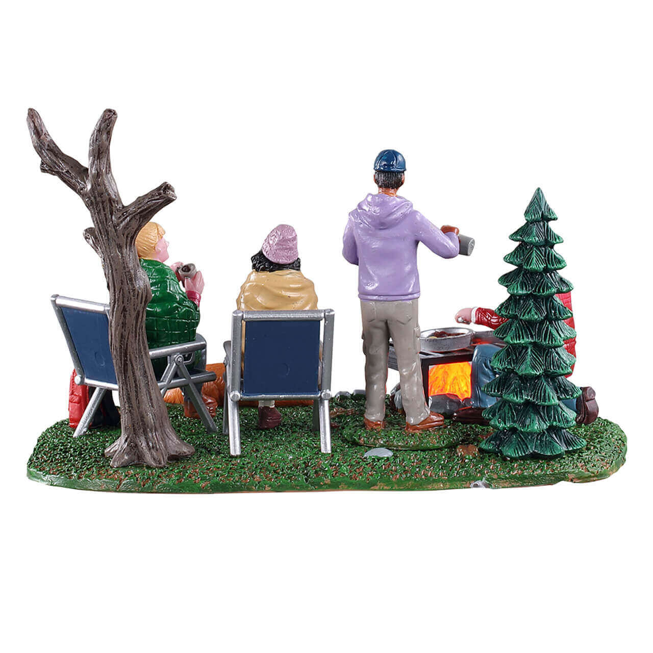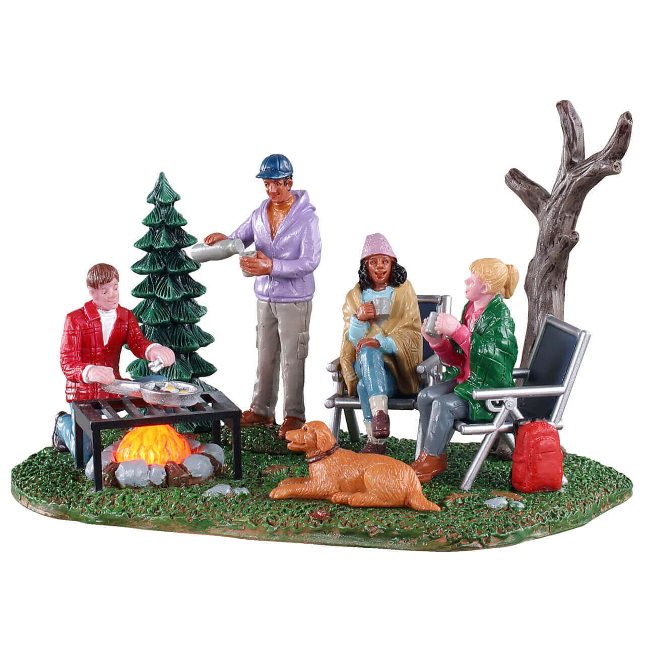 Description: In a tranquil forest, underneath bright stars, two lovely couples are enjoying a serene camping trip. Surrounded by a charming Christmas tree and their lovely dog, they revel in the pristine beauty of nature, while preparing food on the warm fire. Their faces bathed in soft glow, as they engage in captivating tales and create memories that will be cherished for years to come.