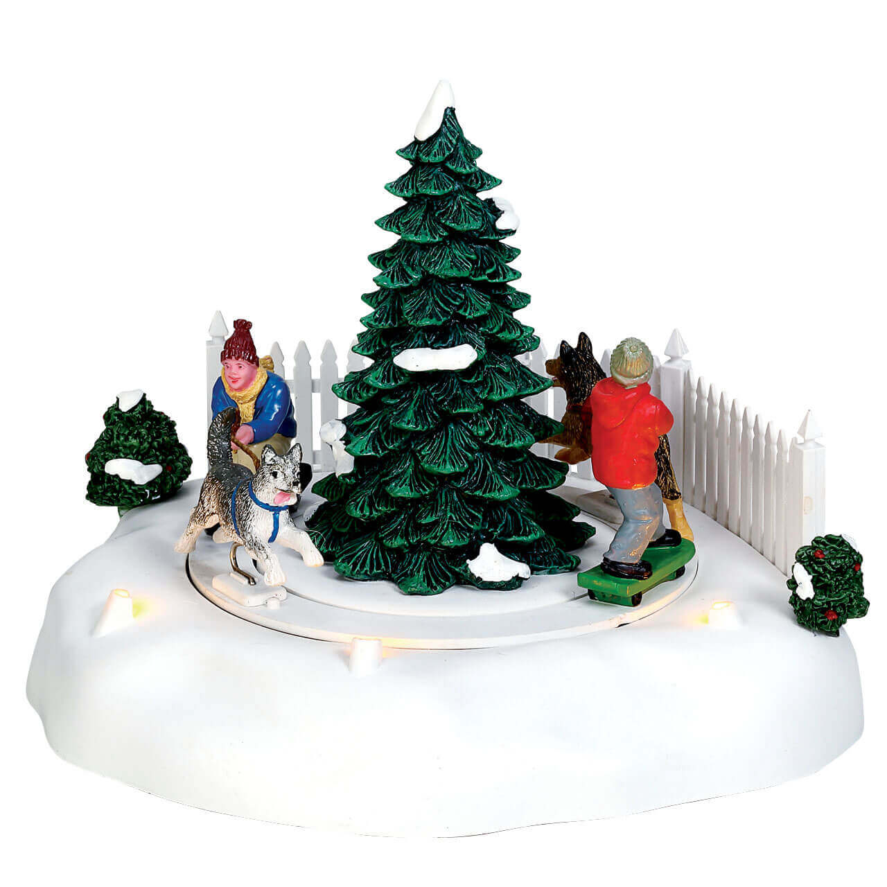 Mushers pulling dogs circle the tree.