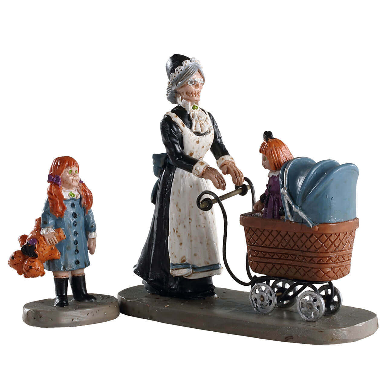 Beneath the eerie moonlight, a sinister woman clad in macabre attire guides a ghostly trolley, one child spookily silent within, the other dragging along. Shadows whisper secrets as they stroll through the night, a haunting scene of wicked lullabies and forgotten fears.