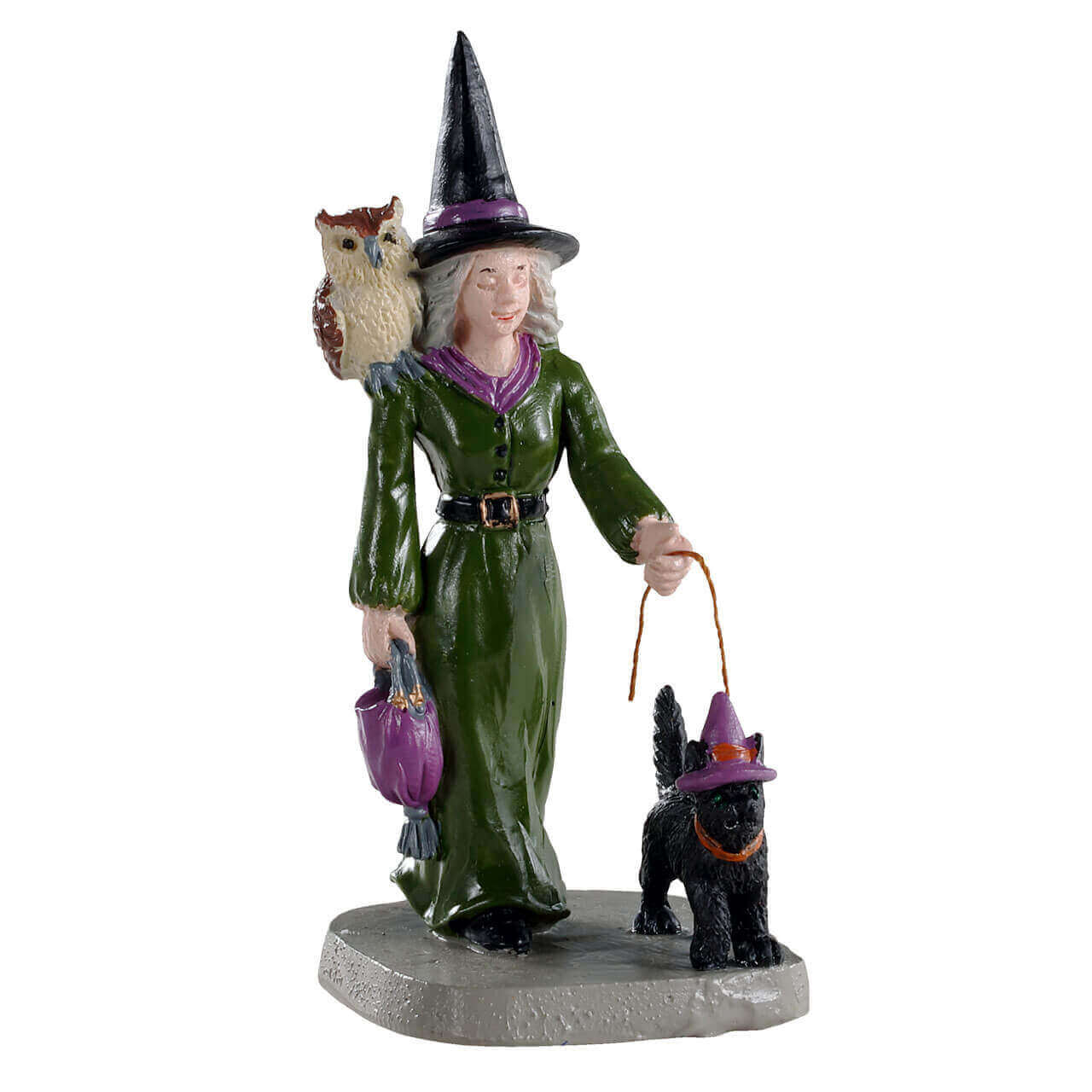 Description: As nightfall comes, an eerie witch puts on her macabre attire and heads to a shopping trip, accompanied by an owl on her shoulder and a cat with a hat by her side.