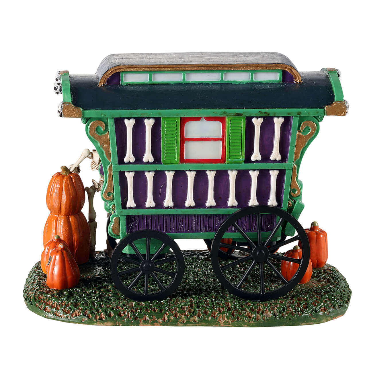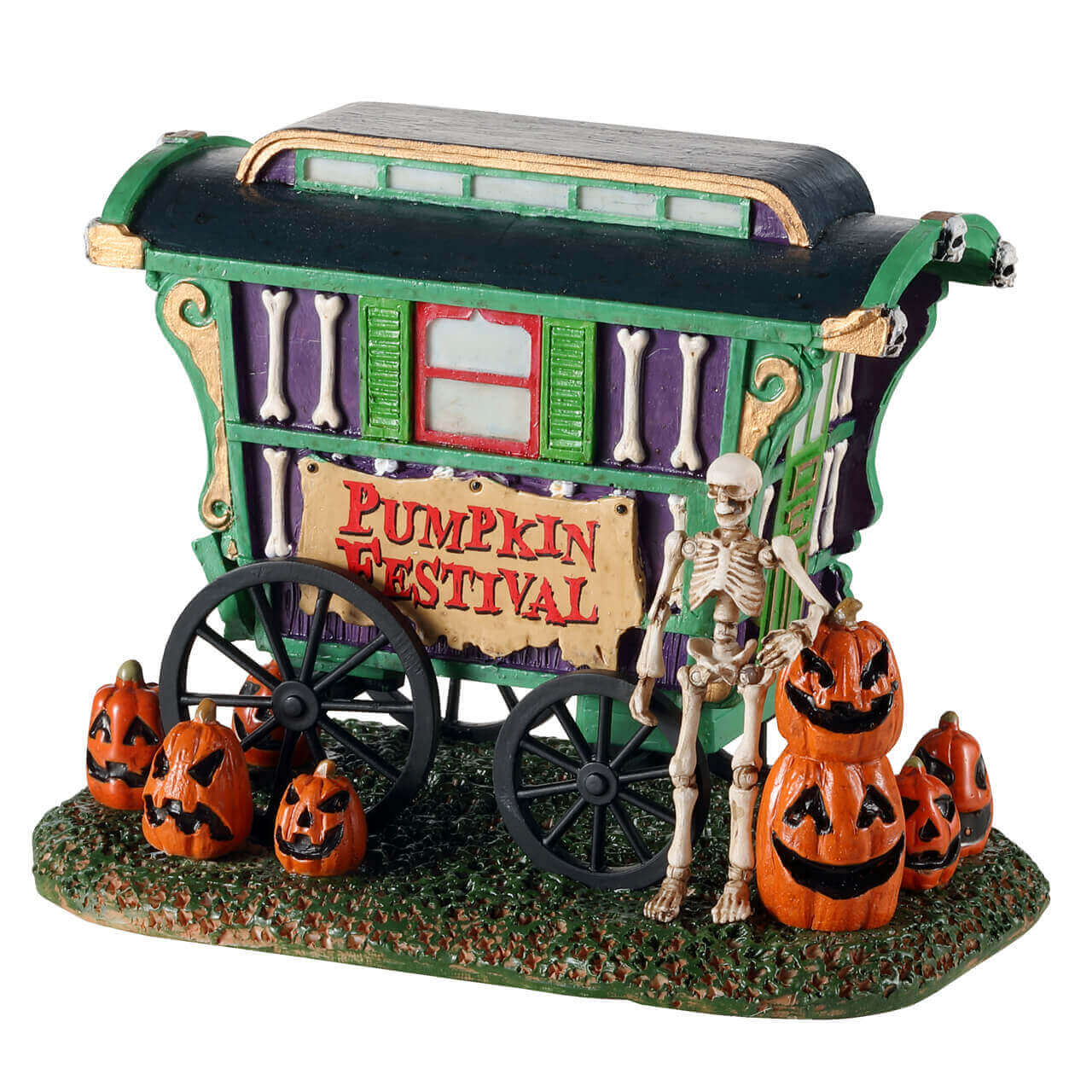 Beside an uncanny caravan brimming with pumpkins, the Pumpkin Festival takes an eerie turn. A skeletal figure presides, casting shadows on the festive gourds. The air is thick with an unsettling ambiance, as if the pumpkins harbor dark secrets. Will you dare approach this macabre scene?