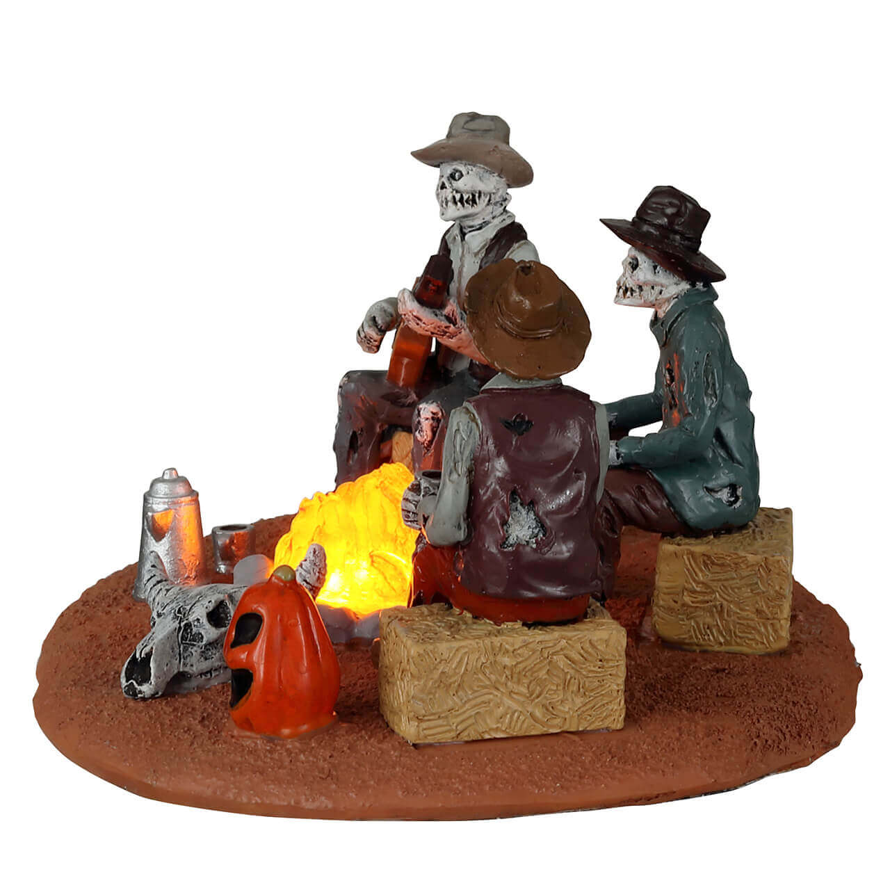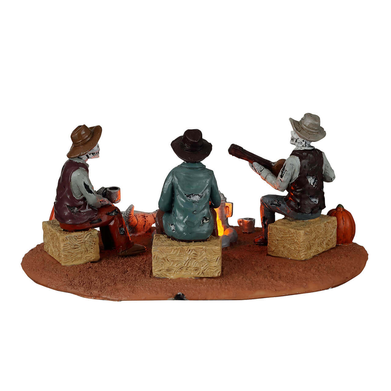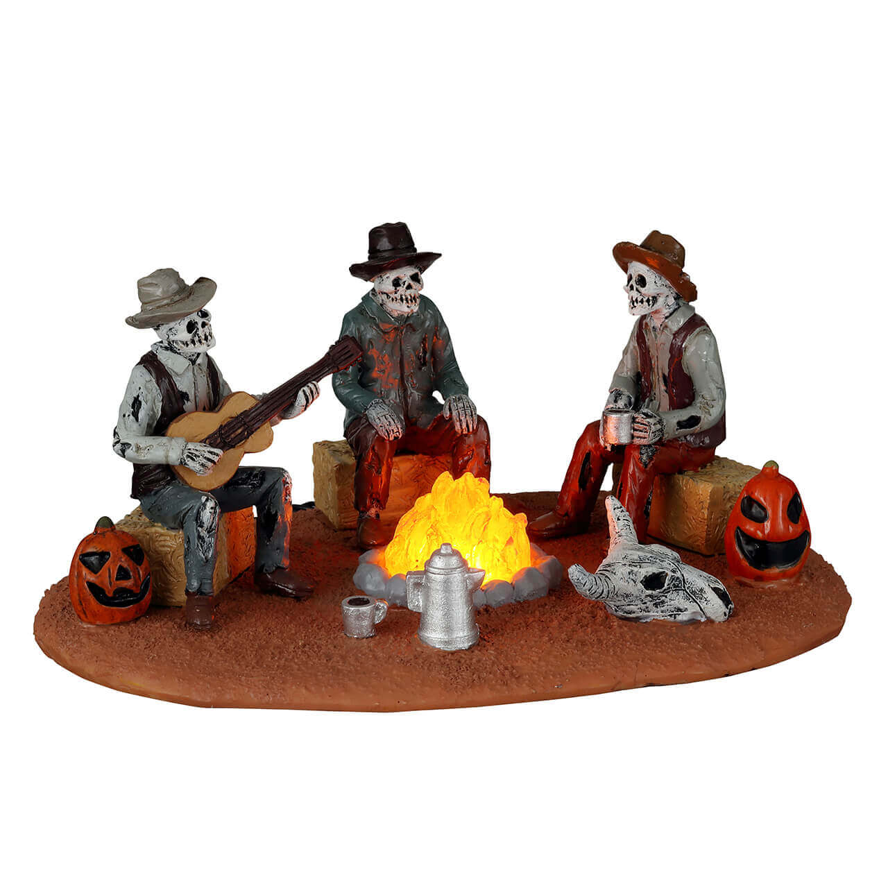 Warming Their Bones is no easy feat, so it's a good thing they have a fire. These three skeleton cowboys are sitting on hay bales around a glowing campfire, and they're enjoying a warm beverage while one of them plays a guitar. On the ground are two Jack-o'-lanterns and the skeletal remains of a bull. Thankfully, they're keeping warm by the fire. Just because they're skeletons doesn't mean they don't get cold.
