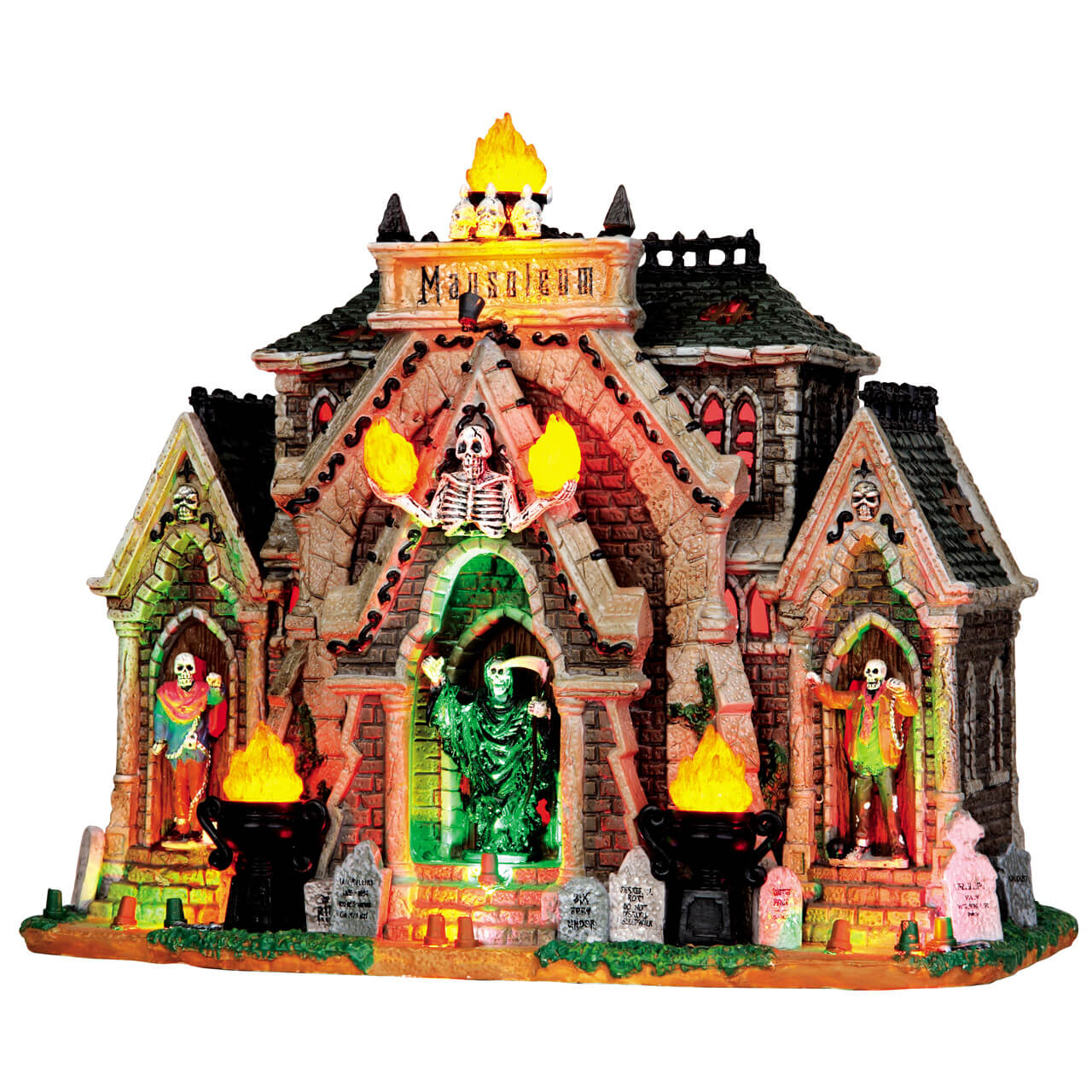 Lights flash on different sceneries coordinating with the script in the soundtrack.