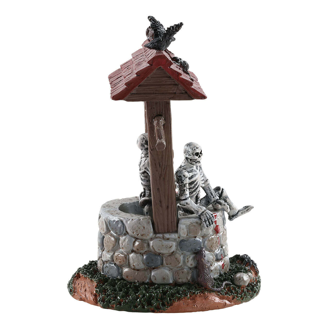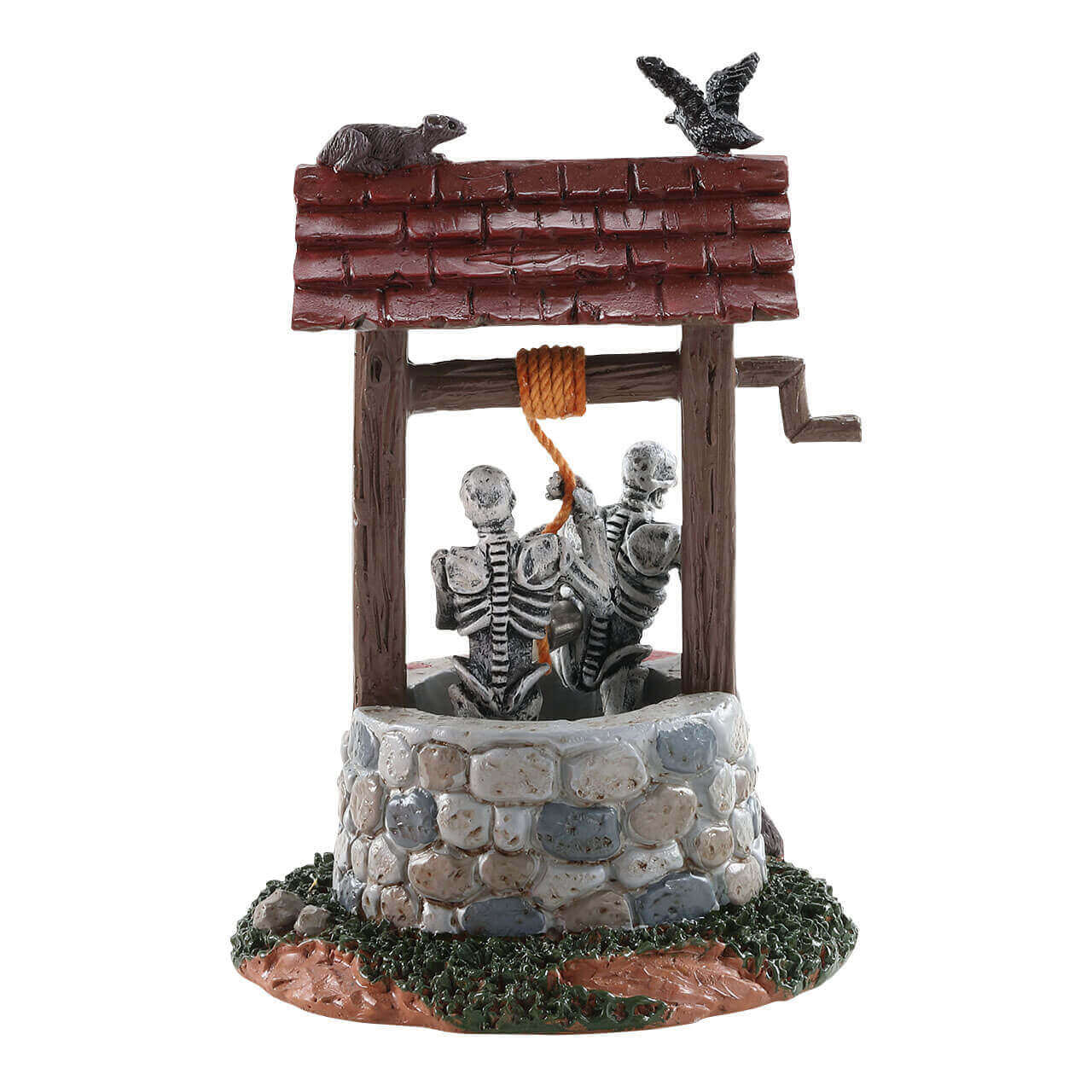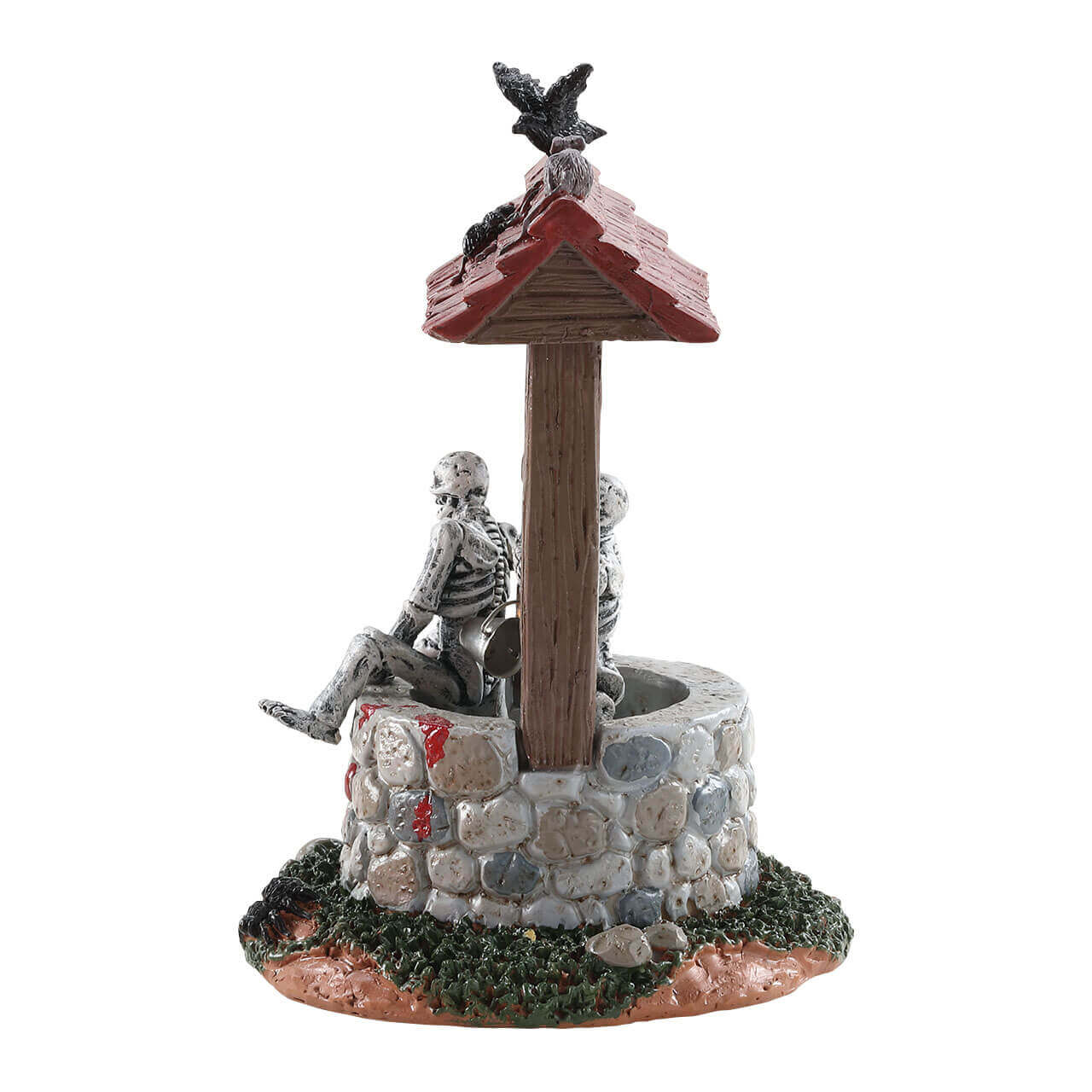 The Ghouls in Well features two skeletons retrieving water from an old well. This table accent also features a crow, a spider, and a rat on the roof of the well.