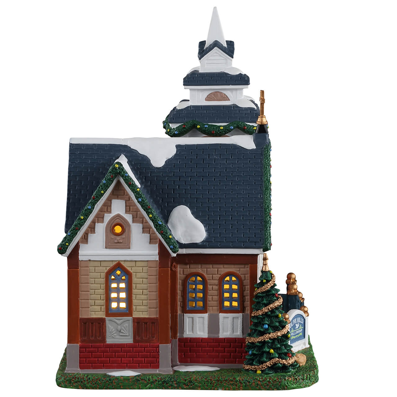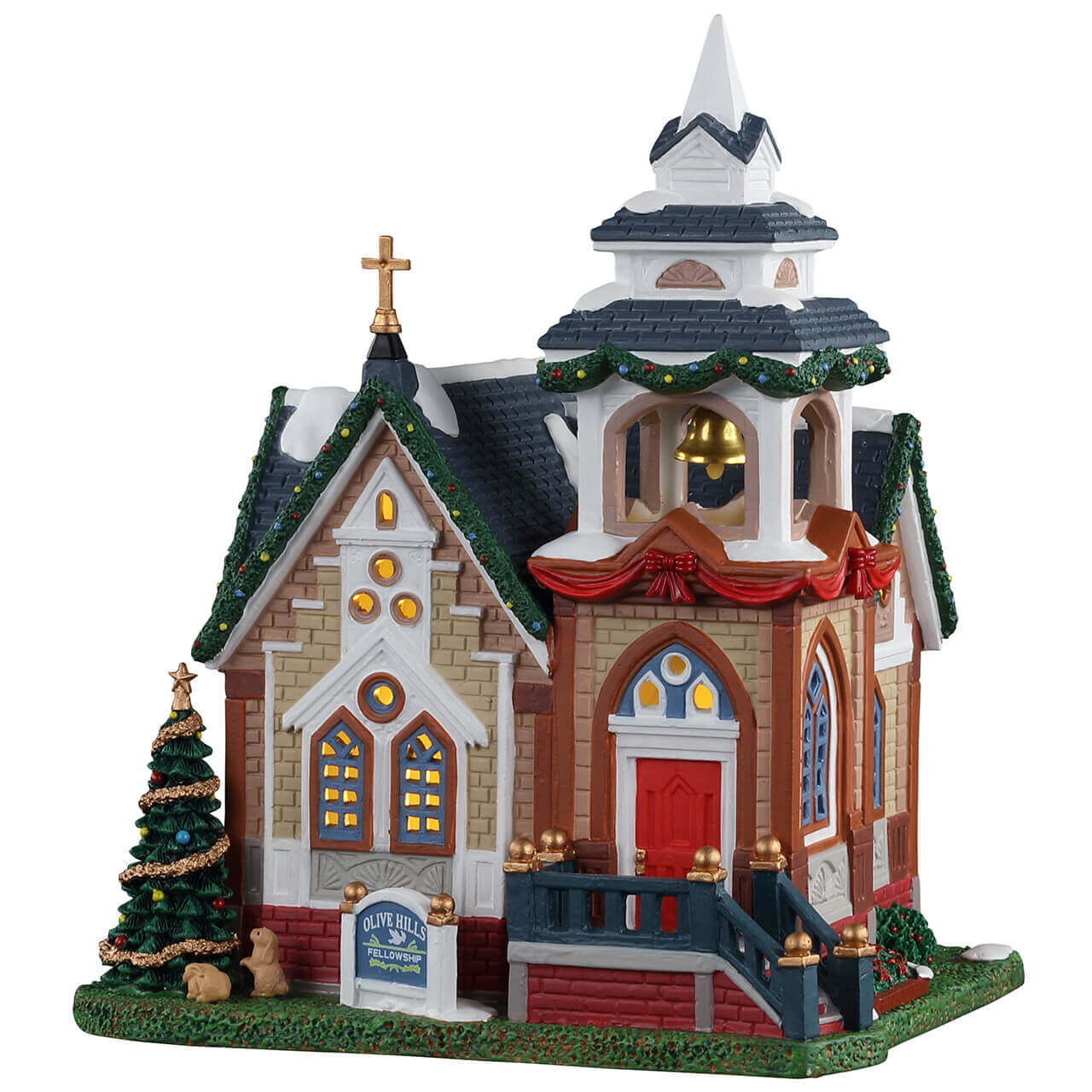 The Olive Hills Fellowship is patiently awaiting Christmas day. The church has an elegant bell tower, while the rest of the building is adorned with wood trimming, intricately shaped windows, and carved stonework. Holly is blooming in the church's planters, and there's a beautifully decorated Christmas tree on the front lawn. The rest of the church is decorated too: all the way from lights on the bushes to ribbons on the bell tower.