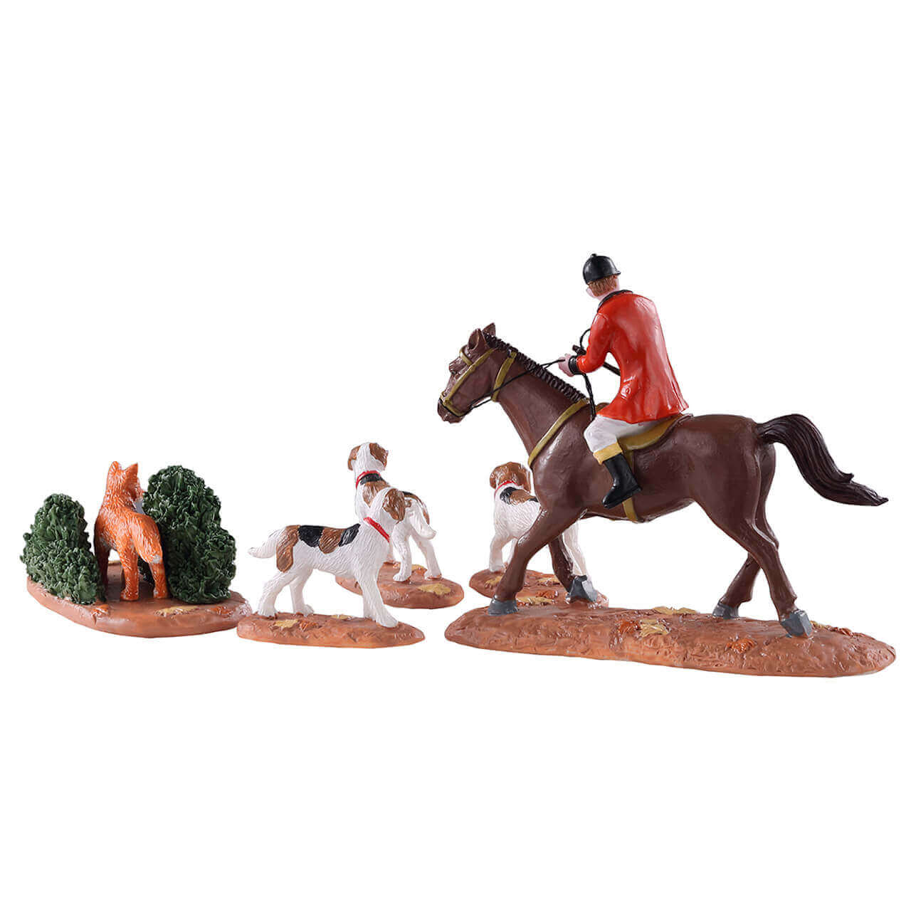 Amidst the rolling hills of Caddington Village, a gallant man on horseback leads three loyal dogs on an exciting fox hunt. With nature’s beauty unfolding around them, the suspense grows stronger, as the sly fox is hiding in a nearby bush.