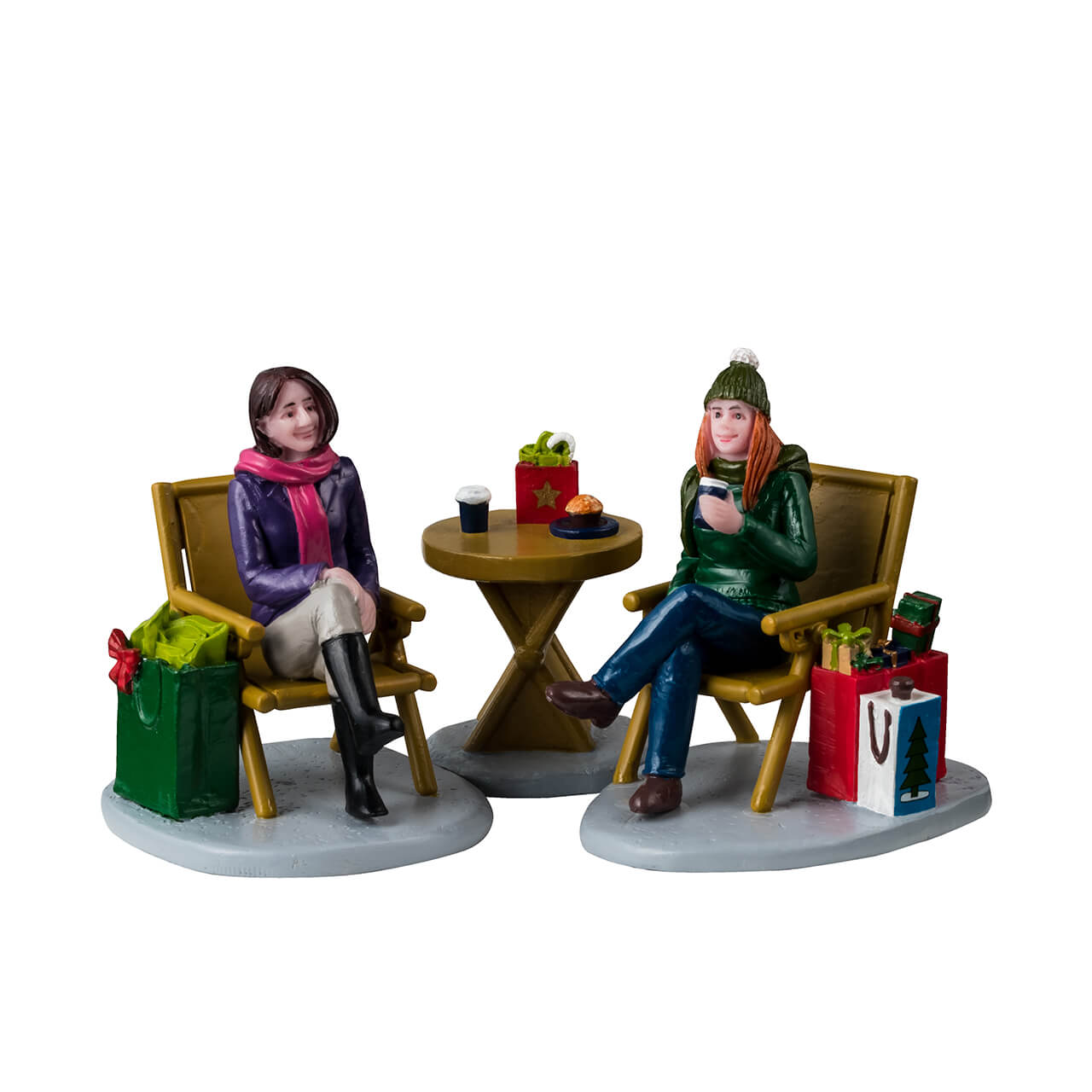 In this winter wonderland scene, two dear friends sit in a quaint, charming café, chatting and enjoying a warm cup of coffee after their Christmas shopping. The glow of the season envelops them, embodying the pleasure in the simplest of moments.