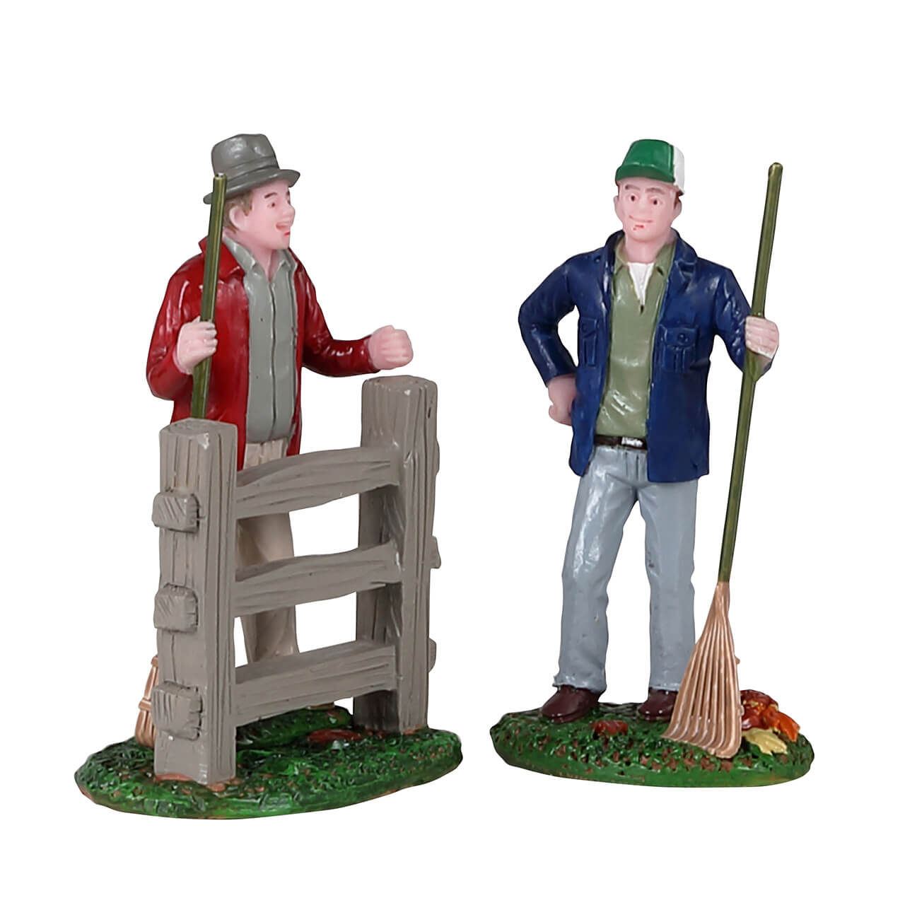 Everyone needs Friendly Neighbors! In this Lemax figurine, two neighbors are sharing a conversation across a wooden fence. Each man is sweeping up freshly fallen autumn leaves from his lawn. One man is wearing a red coat and grey bucket hat, while the other wears a blue coat and a green baseball cap. Remark: Height of the tallest piece shown.