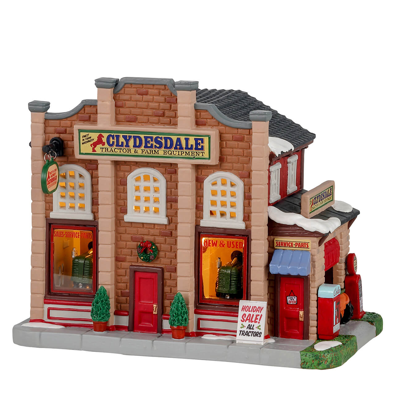 Description: Clydesdale Tractors and Farm Equipment has new and used inventory for the farmers in town. This brick structure has two storefront lit-up windows showcasing the finest tractors for sale. At the side of the building is the entry into the service and parts area. The whole building is painted red and white and there's a sign advertising a holiday sale on tractors!