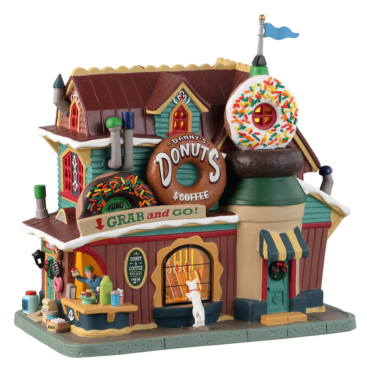 A quick stop at Danny's Donuts & Coffee is sure to fuel you up for a day of holiday shopping or decorating. Outside the exterior shows off delicious-looking decor while inside magic is being made in the form of tasty donuts. The wares are displayed in a front window and the owner beckons with a bag of freshly made donuts just ready for a hungry passerby.