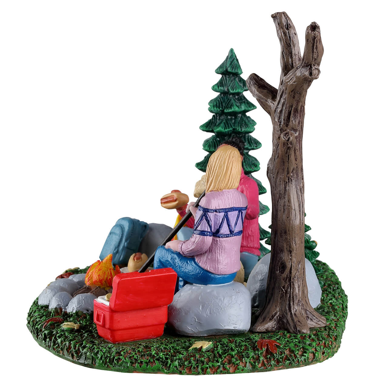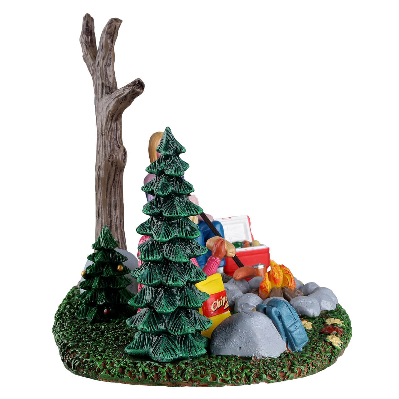 Add this charming Fall Camping Trip scene to the outskirts of your Harvest Crossing Village for a touch of countryside fun. Two best friends and their canine companion look like they are having a great time enjoying nature. With a good fire blazing away, plenty of snacks in the cooler, a huge bag of chips, and some hotdogs to devour, can you think of a better night spent with a pal?
