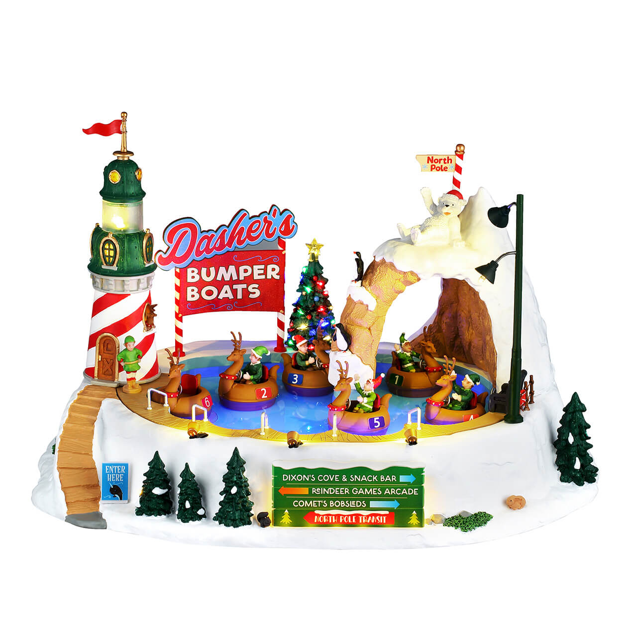 Get ready to get wet at the bumper boat poolthis ride is a splash! Elves steer reindeer rides in joyful loops around the pool in hopes of sneaking up on friends. Every collision is met with a chorus of laughter as fun music fills the air. From the sidelines, Dasher himself watches over the delightful chaos with a smile as his lighthouse flares with sparkling light. Its a ride you dont want to miss!.