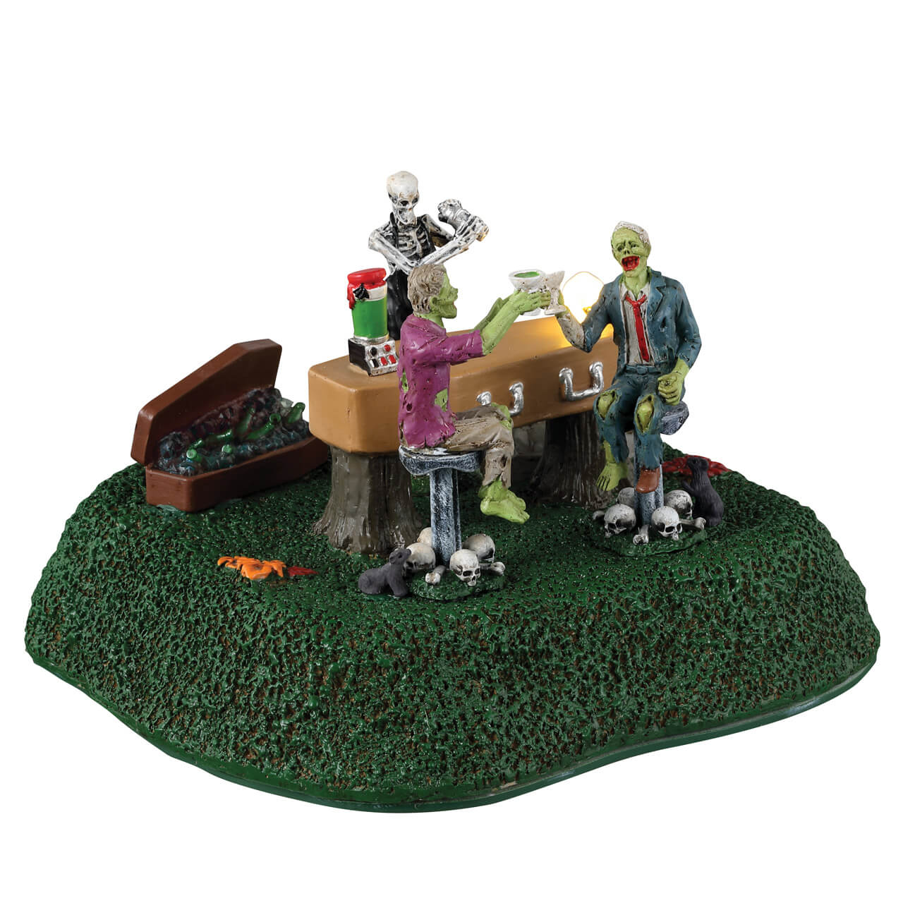Capitalizing on the alarming stock of coffins and materials around town this crafty bartender has set up an irresistible watering hole for his creepy clientele. Placed on top of two stumps a coffin serves as a bar for ghoulish guests while the mixmaster creates a concoction for them to toast and drink. Skulls adorn the barstools while rats scrabble for any nibble that might fall. An open coffin holds ice and bottles so there is always a supply of revolting refreshments on hand for anyone that stops by.