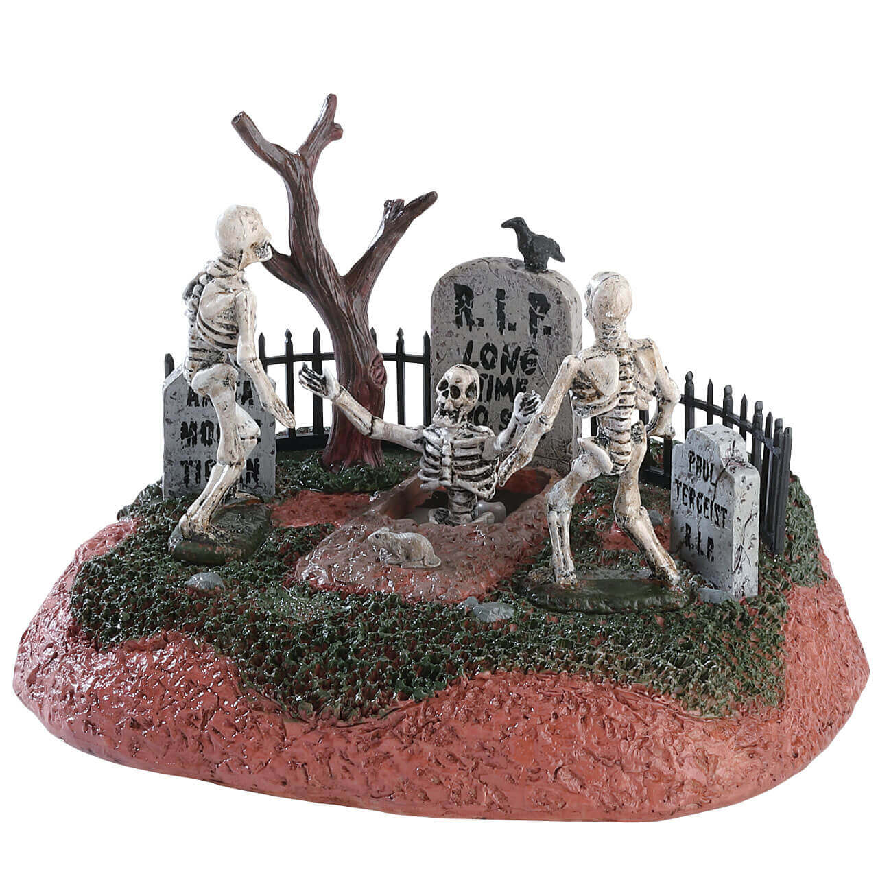 Skeletal figure in the middle shakes mimicking struggling out of the grave.