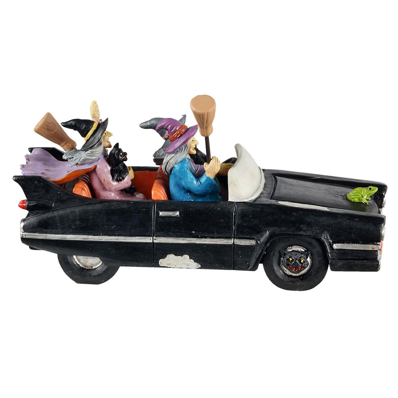 Girls Night Out on Halloween is about to get witchy. This table piece is a black Halloween-themed convertible with black cat rims. Inside the car are three witches enjoying their joy ride around town while they hold onto their trusty black cats and brooms. The witches are dressed in their standard witches' hats and capes. A green toad sits on the hood of the car, joining along for the ride.