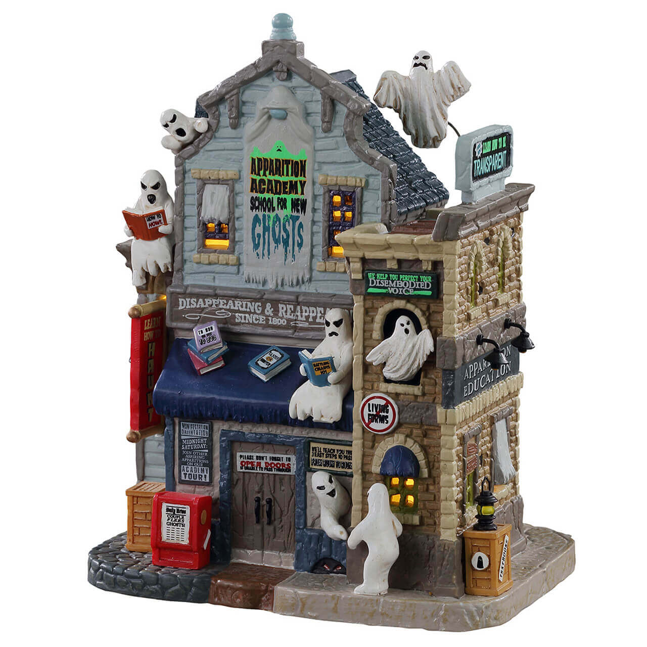 Description: The Apparition Academy is the one and only school for new ghosts. This two-story building is filled with fun signs that hint at what it's like to be a ghost in training. The studious ghosts can be seen throughout the building. Two ghosts are reading books on the roof while another pops his head out of the building. A few others can be seen looking out the window and standing on the front stoop.