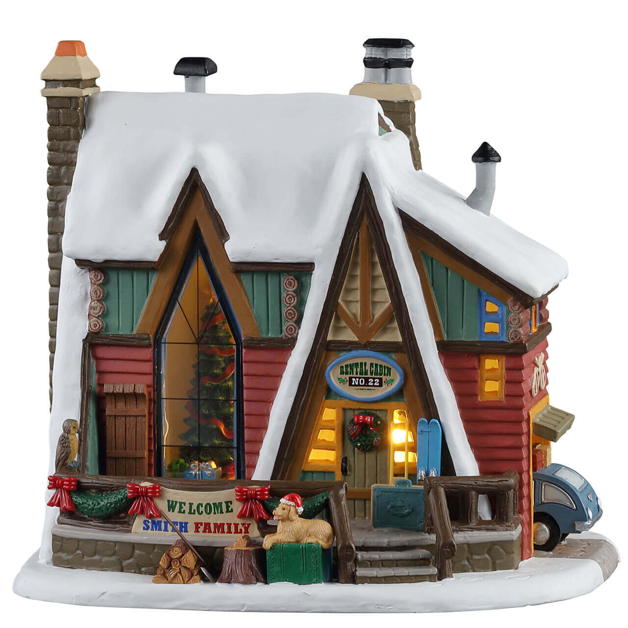Christmas is all about family, so what better way to celebrate it than with a Mountain Holiday Reunion? This A-frame wooden cabin has a car pulling into the garage and that's packed full with the family's luggage. The front porch has a big banner that says "Welcome Smith Family," and an excited pup sits on more luggage, wearing a Christmas hat. Through the front window you can see the biggest Christmas tree filled with presents underneath.